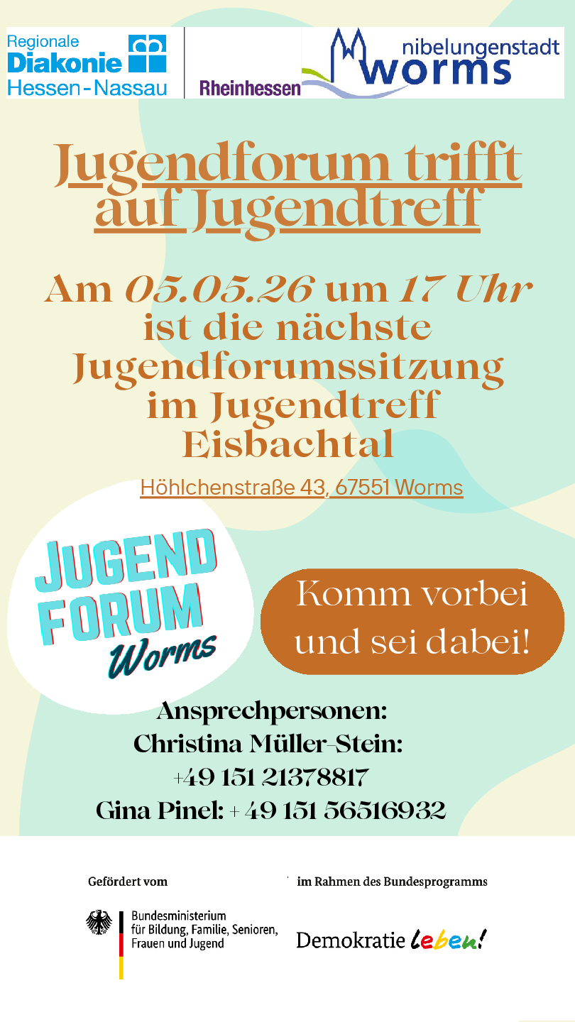 Im Jugendforum Worms haben Jugendliche und jungen Erwachsene die Möglichkeit, sich für ein vielfältiges, gewaltfreies und demokratisches Miteinander in der Stadt einzusetzen und etwas zu bewegen. Interessierte sind herzlich zur nächsten Sitzung im Jugendtreff eingeladen.